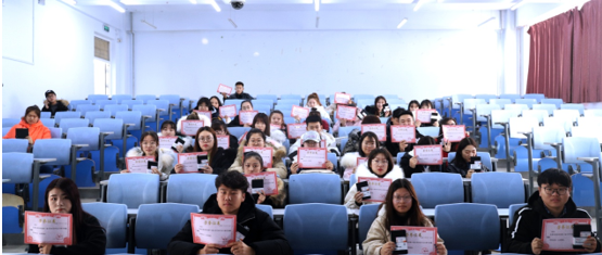 随后,通识教育学院院长苏丹、谷柏玲教授及全体大学英语教师为93名获奖选手进行了颁奖,学生们在教室前与教师合影留念。